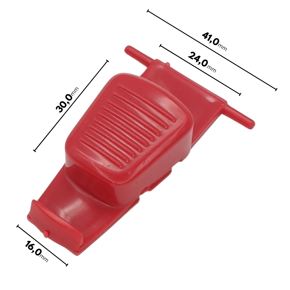 Botão Trava Tecla: 30,0 x 41,0 x 24,0 x 16,0mm (Comprimento do botão x Largura das travas laterais x Largura do botão x Largura menor);