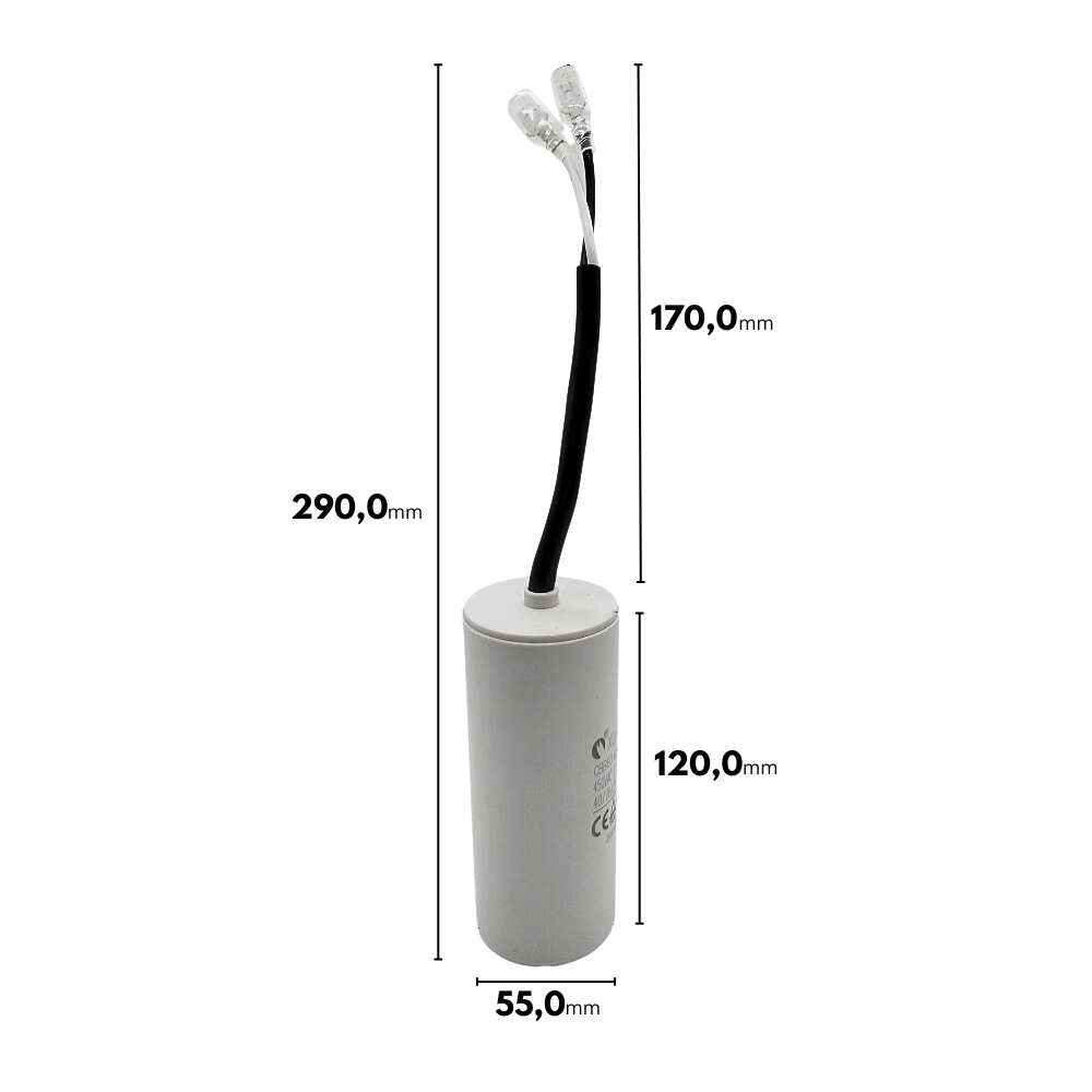 - Medidas: 290,0 x 120,0 x 55,0 x 170,0mm (Altura total x Altura do capacitor x Diâmetro x Comprimento dos fios);