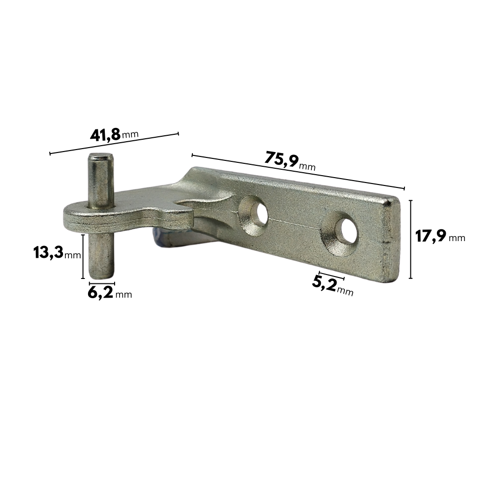 - Medidas: 75,9 × 41,8 × 17,9 × 13,3 × 6,2 x 5,2mm (Comprimento da base x Comprimento do corpo da dobradiça x Largura x Comprimento do pino de encaixe x Diâmetro do pino de encaixe x Diâmetro de encaixe do parafuso);