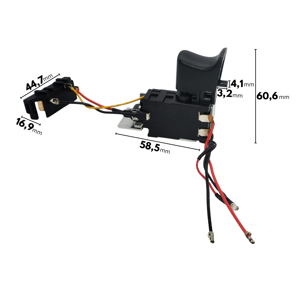- Medidas: 60,6 x 58,5 x 3,2 x 4,1 x 44,7 x 16,9mm (Altura do interruptorx Comprimento do interruptor x Comprimento do pino x Diametro do pino x Comprimento do terminal conector x Largura do terminal conector);