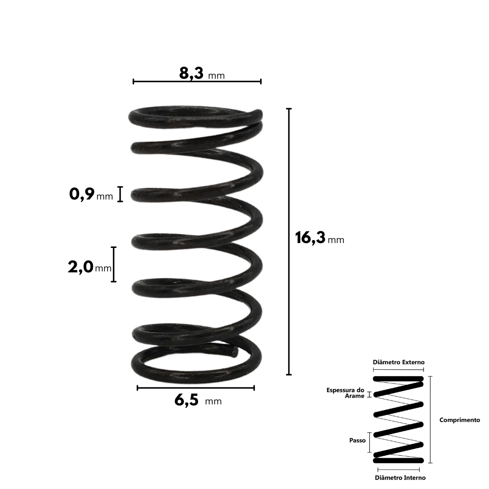 - Medidas: 8,3 X 0,9 x 2,0 x 6,5 x 16,3mm (Diâmetro Externo x Expessura do Arame x Passo x Diâmetro Interno x Comprimento);