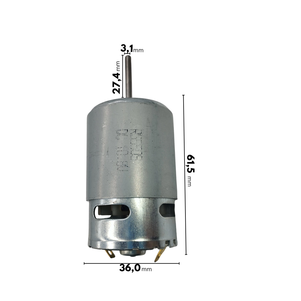 - Medidas: 61,5 x 36,0 x 27,4 x 3,1mm (Comprimento corpo do motor x Diâmetro total x Comprimento do encaixe x Diâmetro do pino do encaixe);