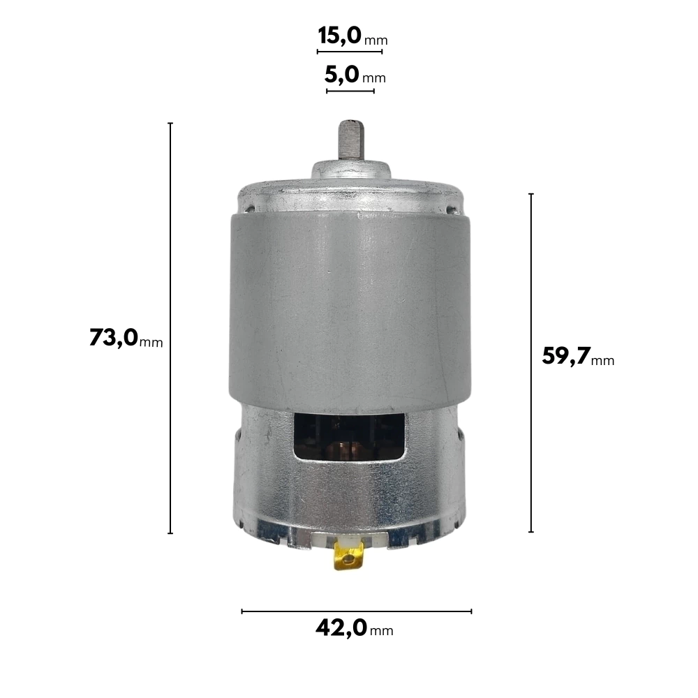 - Medidas: 73,0 x 59,7 x 42,0 x 5,0 x 15,0mm (Comprimento total x Comprimento do corpo do motor x Diâmetro do motor x Diâmetro do encaixe do engrenagem x Diâmetro da engrenagem);