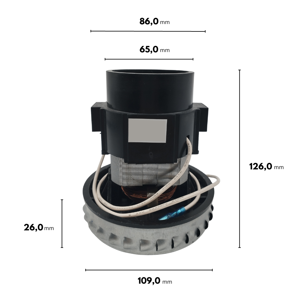 Altura x Diâmetro Superior x Diâmetro nas Escovas x Diâmetro da Base Inferior x Altura da Turbina: 126 x 65 x 86 x 109 x 26 mm;