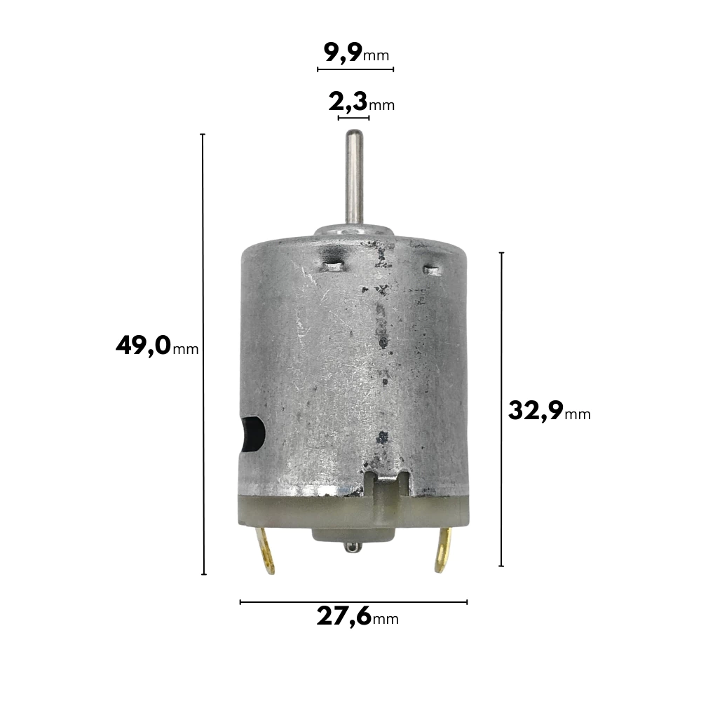 - Medidas: 49,0 x 32,9 x 27,6 x 9,9 x 2,3mm (Comprimento total x Comprimento do corpo do motor x Diâmetro total x Diâmetro do encaixe x Diâmetro do pino do encaixe);