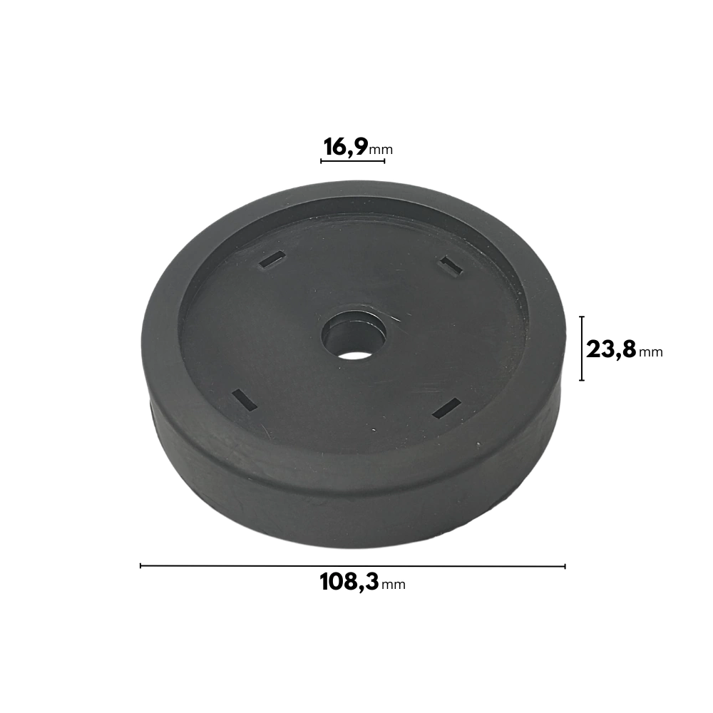 - Medidas: 108,3 x 16,9 x 23,8 (Diâmetro total x Diâmetro de encaixe x Espessura);