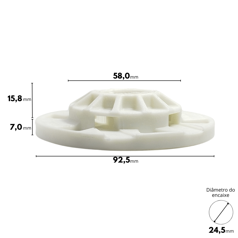 - Medidas: 92,5 x 58,0 x 24,5 x 7,0 x15,8mm (Diâmetro total x Diâmetro do acoplamento x Diâmetro do encaixe x Espessura da base x Altura do acoplamento);
