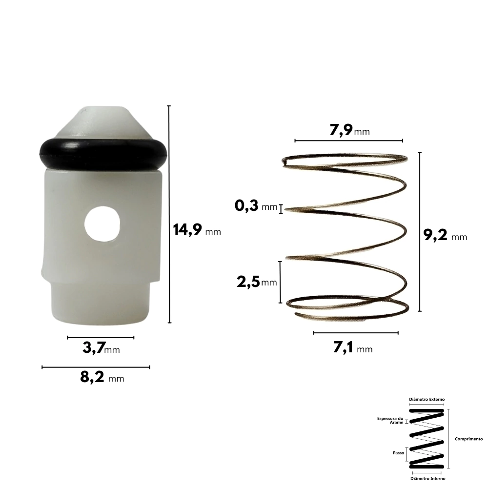 Mola: 9,2 x 7,1 x 7,9 x 2,5 x 0,3mm (Comprimento x Diâmetro interno x Diâmetro externo x Passo x Espessura do arame);