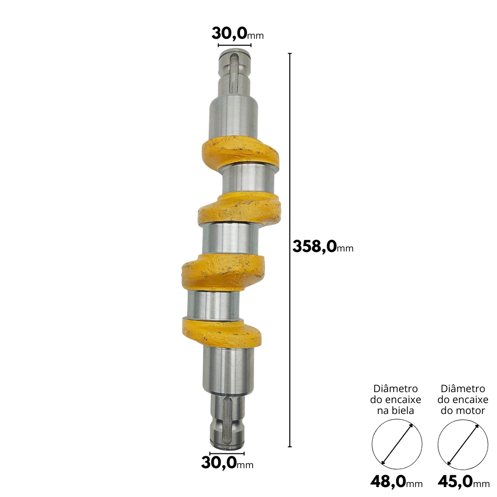 - Medidas: 358,0 x 48,0 x 45,0 x 30,0mm (Comprimento x Diâmetro de encaixe da biela x Diâmetro de encaixe do motor x Diâmetro de encaixe da polia);